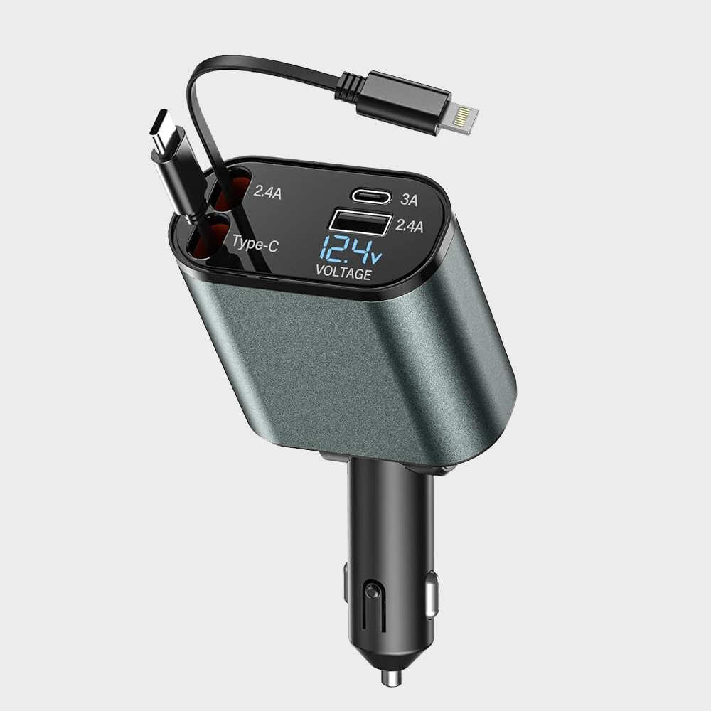 + Free ShippingRetractable Car Charger 120W 2 Ports Type-A & Type-C with Built-in Cable (USB-C/Lightning), Power Delivery Fast Charging, Quick Charge, LED Digital Display Volt & Watts, 12V/24V
